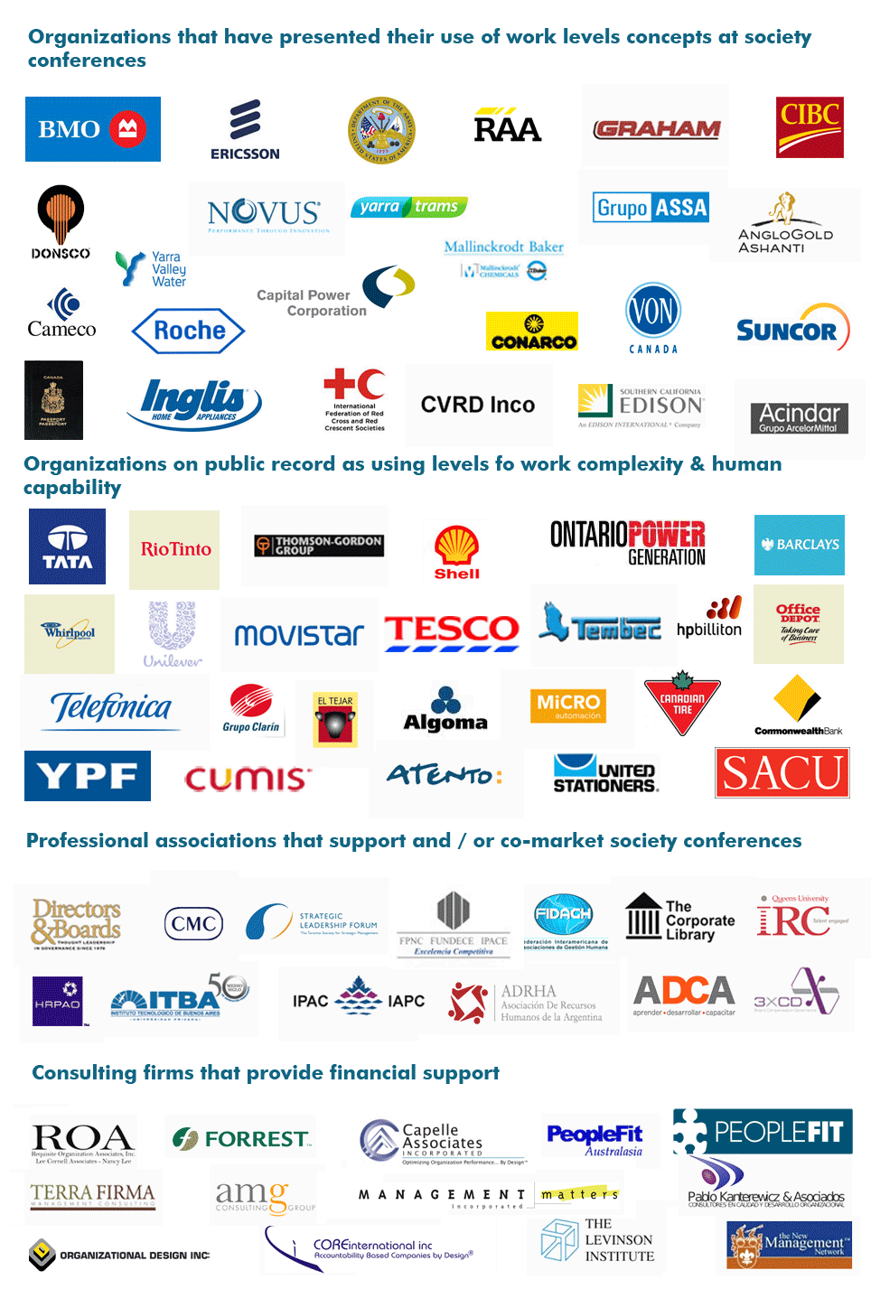 - Organizations that have presented their use of levels of work complexity and human capability at Global Organization Design Society conferences