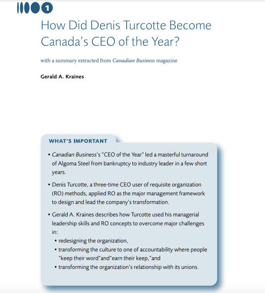 Gerald A. Kraines, M.D., president and CEO of The Levinson Institute, writes about Denis Turcotte and his being named “CEO of the Year” in 2006 by Canadian Business magazine. Turcotte’s story is one of inspiration and achievement. Kraines, who worked many years with Elliott Jaques and who wrote the book, Accountability Leadership, building on Jaques’s concepts, has been one of Turcotte’s major consultants for more than ten years in three successive senior executive roles. Here, Kraines condenses the Canadian Business article and describes the many aspects of RO leadership that Turcotte applied to successfully transform Algoma Steel. With the application of requisite concepts, Turcotte was able to change the culture at Algoma Steel and achieve a major turnaround in a firm that had been teetering on the brink of bankruptcy twice in the previous ten years.